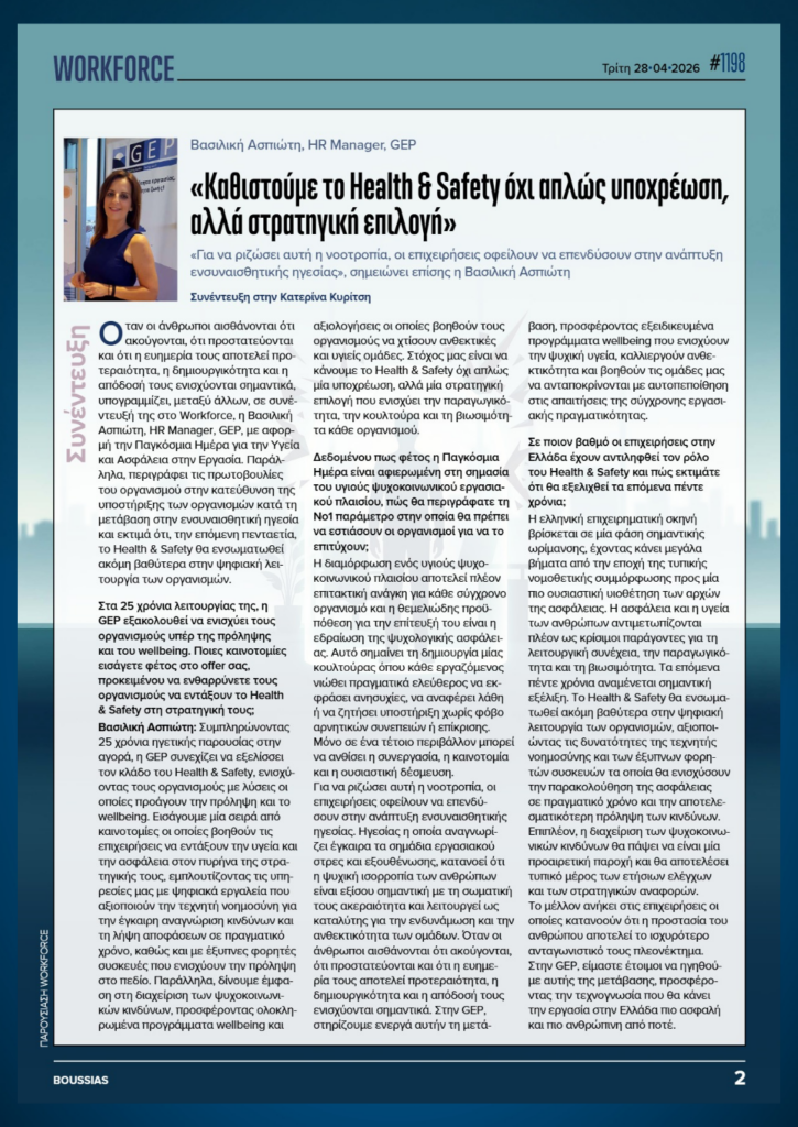 On the occasion of the World Day for Safety and Health at Work (April 28, 2026) and this year’s theme “Healthy Workplaces: The Role of Psychosocial Risks and Worker Participation”, GEP focuses on two critical pillars: psychological safety and active employee participation.