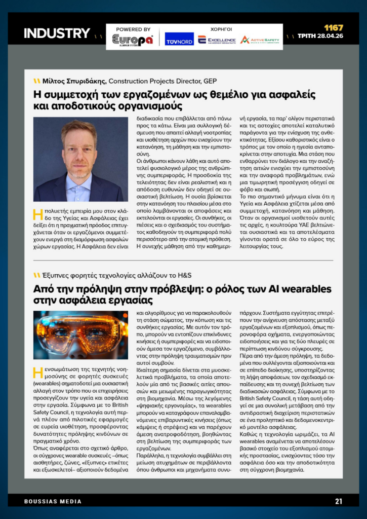In Industry, Miltos Spiridakis, Construction Projects Director at GEP, focuses on the importance of employee participation and a learning culture in strengthening workplace safety.
